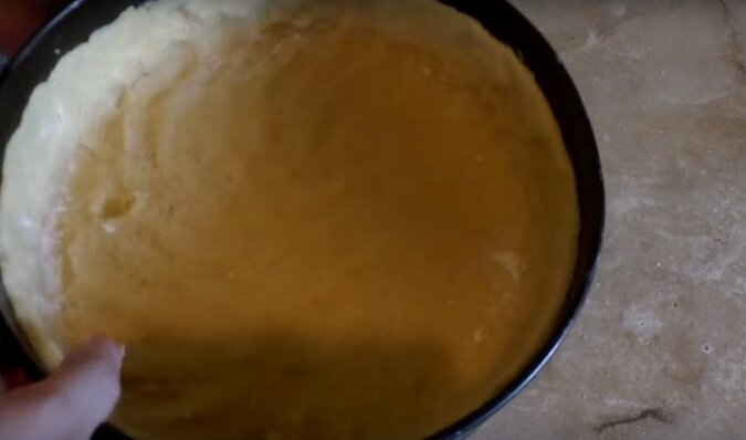 4. Weź formę do pieczenia (ja mam o średnicy 24 centymetrów), wyjmij schłodzone ciasto z lodówki. Formę smarujemy masłem, rozprowadzamy ciasto w formie, nie zapominając o formowaniu boków.