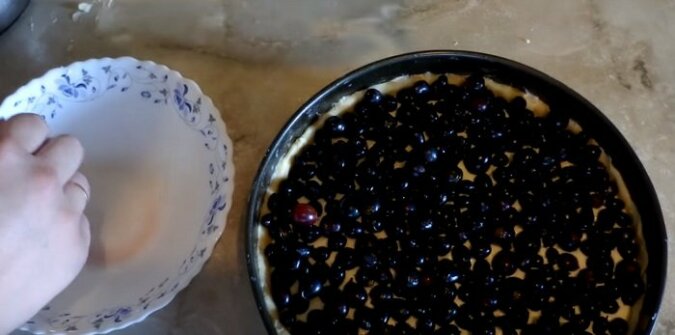 5. Masę twarogową przełożyć na ciasto, wyrównaj. Ułóż wcześniej umyte jagody czarnej porzeczki na twarogu.