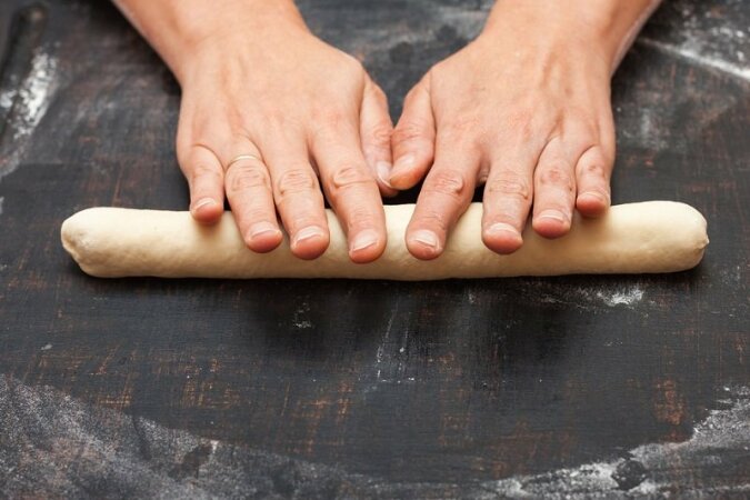 Uformuj z ciasta rulonik i pokrój na 16 części.