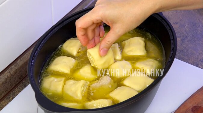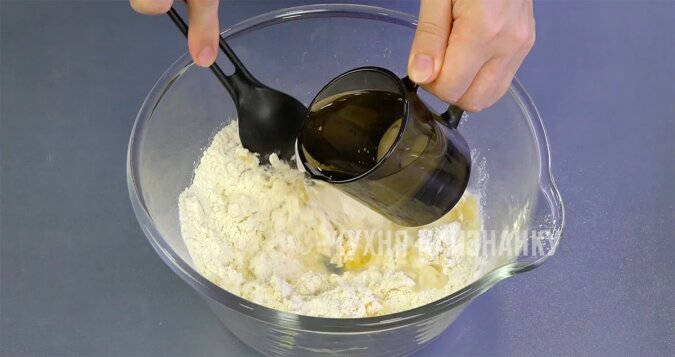 Przygotowuje ciasto, takie jak na pierogi. Mieszam jajko, sól i olej roślinny. Dodaję do mąki. Mieszam przez chwilę i zalewam wrzątek. Mieszam ciasto.