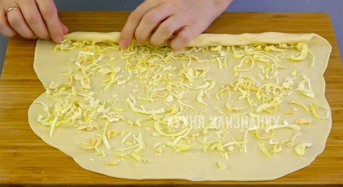 Deskę smaruje olejem. Ciasto rozwałkowuję na bardzo cienki plaster i wykładam na nie cebulę. Można użyć zwykłej pokrojonej białej cebuli i odrobinę czarnego pieprzu. Cebulę można wstępnie podsmażyć.