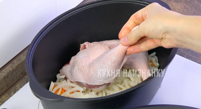 Do naczynia wlewam parę łyżek oleju roślinnego, pokrojoną cebulę i pokrojoną marchewkę. Na wierzch - kawałki kaczki. Przykrywam pokrywką i duszę 25-30 minut.