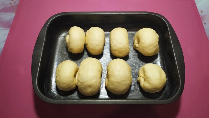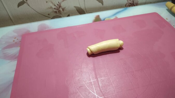Więc bierzemy do rąk kawałek ciasta, zatem rozwałkowujemy go wałkiem do ciasta, zwijamy w rolkę, dobrze łącząc ze sobą brzegi ciasta, zginamy na pół i ponownie łączymy ze sobą brzegi. Następnie bierzemy blachę do pieczenia (ja akurat mam formę o rozmiarach 20x30 cm), smarujemy masłem, wykładamy rolki z ciasta, zatem przykrywamy ręcznikiem i zostawiamy na 20-25 minut, aby ciasto się podniosło.