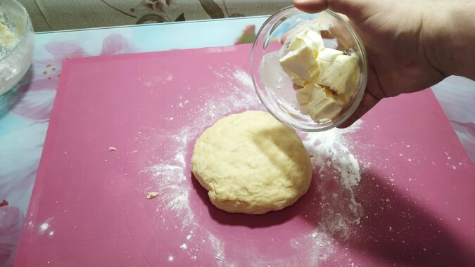 Do głębokiej miski wlewamy mleko, dodajemy cukier, sól, jajka, a następne dokładnie mieszamy trzepaczką. Następnie do miski dodajemy trochę przesianej mąki, a także drożdże i ugniatamy ciasto. Mąkę należy dodawać stopniowo! Teraz do miski dodajemy masło, a zatem kontynuujemy wyrabianie ciasta. Jeśli jest problem z dokładnym wymieszaniem całości z masłem, możemy dodać trochę mąki.