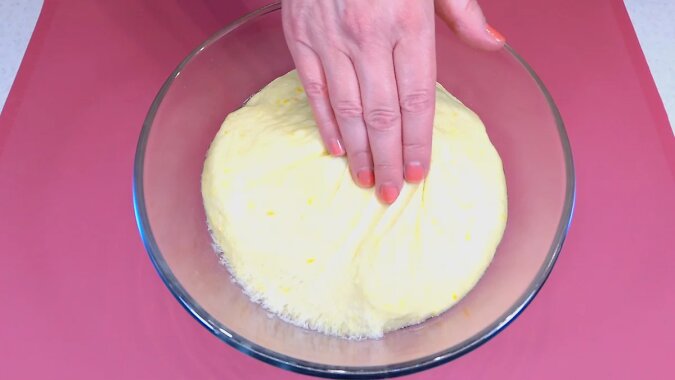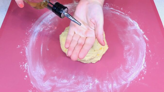 Ciasto będzie dość lepkie, ale nie trzeba dodawać do niego więcej mąki. Aby ugniatanie było łatwiejsze, możesz natłuścić ręce olejem roślinnym.