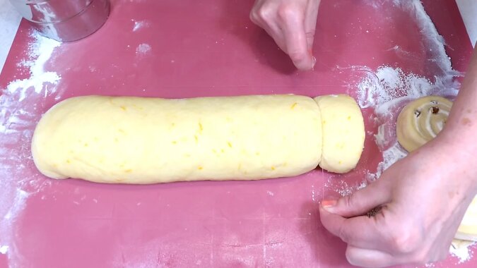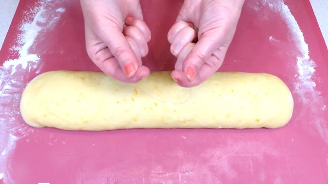 Delikatnie zawiń ciasto w rolkę i wyrównaj rękami. Do uformowania bułeczek będziemy potrzebować żyłki wędkarskiej lub mocnej nici.