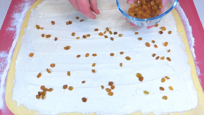 Rodzynki układam na twaróg. Nie moczę ich. Rodzynki podczas pieczenia staną się bardzo miękkie.