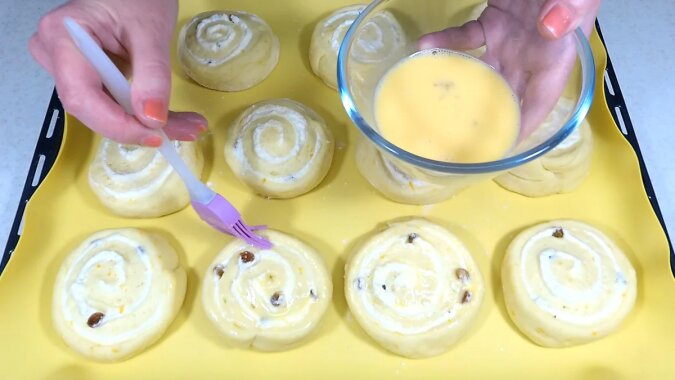 Gdy tylko bułeczki urosną, natychmiast je posmaruj mieszanką jajka i mleka.