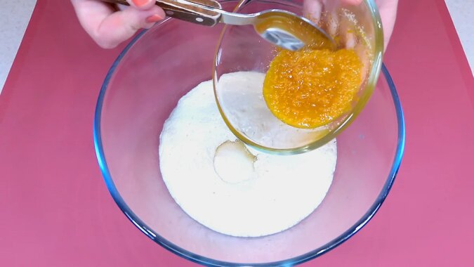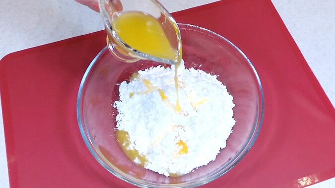 W czasie kiedy drożdże się aktywują, należy przygotować aromatyczny dodatek do ciasta. Aby to zrobić, zetrzyj skórkę jednej małej pomarańczy na drobnej tarce i wymieszaj z 1,5 łyżki cukru. Wyciśnij sok z samej pomarańczy i pozostaw do dalszego przygotowania glazury.