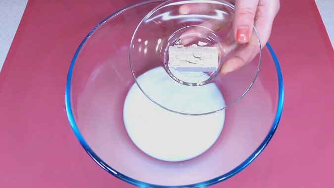 Wlej ciepłe mleko i kefir do miski, dodaj 1/2 łyżeczki cukru (weź z całkowitej ilości wskazanej do ciasta), pokrusz świeże drożdże i dodaj 1,5 łyżki mąki z górką (również weź z całości). Mieszaj trzepaczką do rozpuszczenia drożdży i odstaw w ciepłe miejsce na 15 minut. Zaczyn drożdżowy powinien w tym czasie zacząć się pienić.