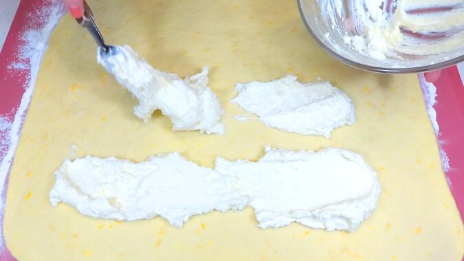 Ciasto rozwałkować na warstwę o grubości około 45x45 cm, ułożyć przygotowany twaróg na wierzchu i równomiernie rozprowadzić go, nie za blisko brzegów.
