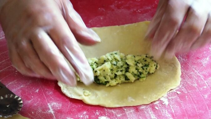4. Każdy kawałek ciasta rozwałkować na okrągłą cienką warstwę, na jedną połowę nałożyć nadzienie serowe, a drugą przykryć.