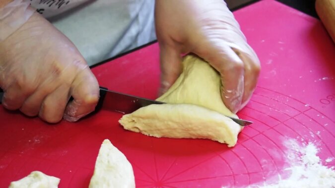3. Rozwałkuj ciasto na kiełbasę na posypanej mąką powierzchni i pokrój na 10-12 kawałków.