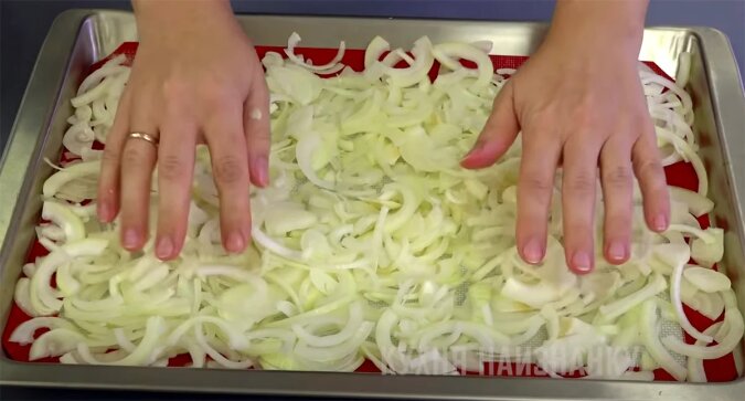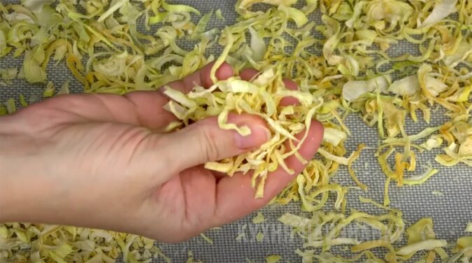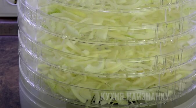 Pierwszy – w piekarniku. Blachy z cebulą wkładam do piekarnika, drzwiczki powinny być uchylone (można użyć łyżkę lub ręcznik). Należy je suszyć w temperaturze 80 stopni przez około 4-6 godzin (w zależności od piekarnika i samej cebuli).
