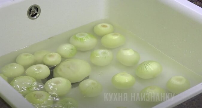 Cebulę czyszczę i siekam. Aby mniej płakać podczas krojenia cebuli, używam jednego z 50 znanych sposobów, który pomaga nie płakać - biorę wodę do buzi. Wygląda śmiesznie, ale działa!