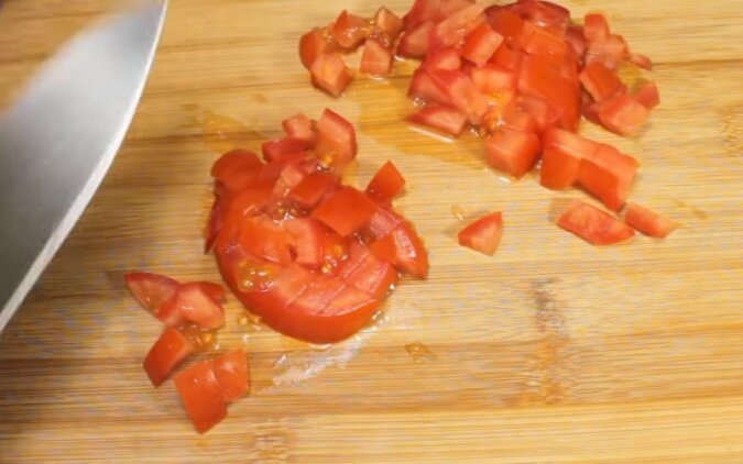 3. Pomidora pokrój w drobną kostkę i wsyp do masy jajeczno-serowej.