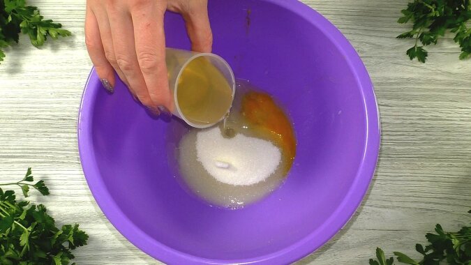Do miski dodaj jajko, szczyptę soli, cukier, olej roślinny i dobrze wymieszaj.