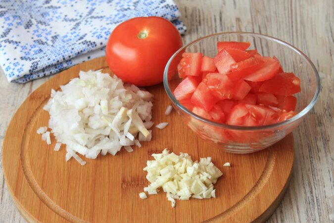 Przede wszystkim myjemy i obieramy warzywa, cebulę i czosnek, staramy się drobno-drobno pokroić, pomidory w trochę większe kawałki.