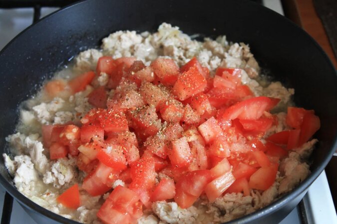 Następnie dodaj posiekane pomidory, sól i przyprawy, wymieszaj. Smaż przez kolejne 3-4 minuty.