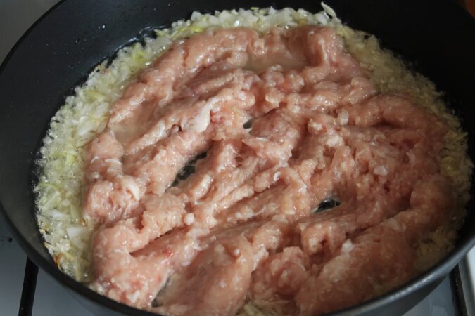 Dodaj mięso mielone - tym razem mam kurczaka, ale wybierz absolutnie wszystko, co lubisz... Wszystko wymieszaj - cała masa mielonego mięsa powinna zjaśnieć, a nawet trochę się zarumienić.