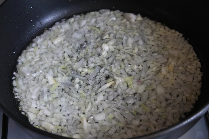 Wlej trochę oleju roślinnego na patelnię, włóż posiekaną cebulę i czosnek, smaż przez kilka minut.