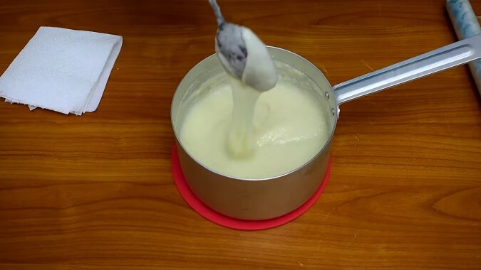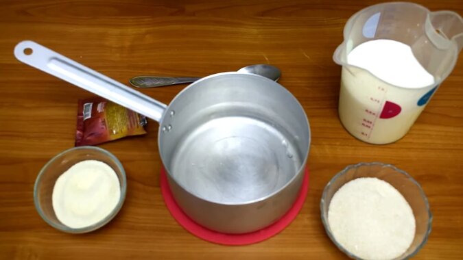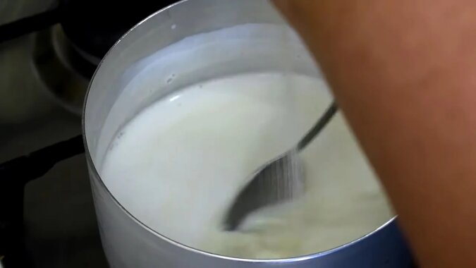 Najpierw należy ugotować kasze manną. Będę gotować w stary sposób. Wlewam mleko do rondla, dodaję cukier i cukier waniliowy, wszystko mieszam i wstawiam na ogień.