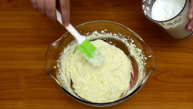Stopniowo dodając do ubitą śmietankę do kremu, delikatnie mieszam całość łopatką.