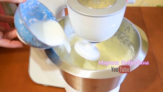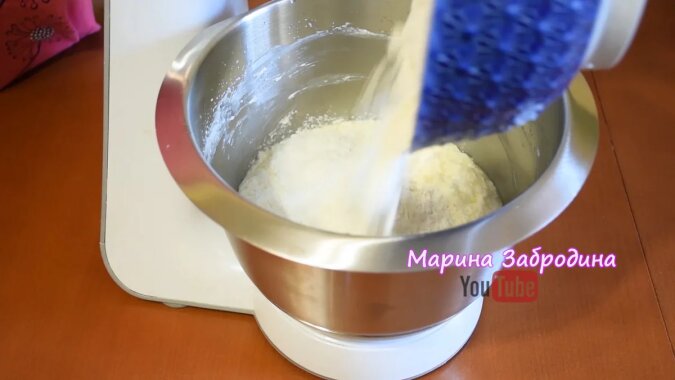 5. Na koniec dodać mąkę i proszek do pieczenia i szybko zagnieść jednorodne ciasto.