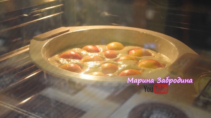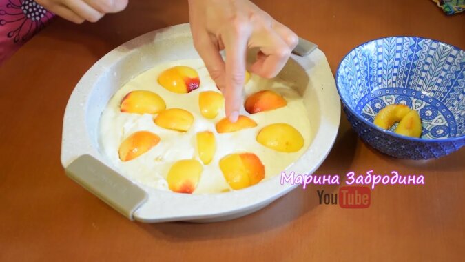 7. Umieszczamy go w przygotowanym naczyniu do pieczenia i układamy ćwiartki moreli na wierzchu ściętą stroną do ciasta.