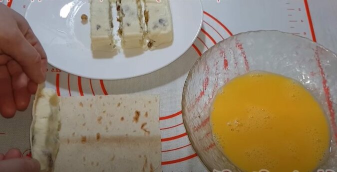 Pokrój arkusz lawaszu na 8 części i owiń masę twarogową rolką, podwijając brzegi.