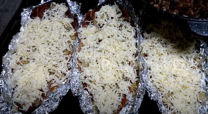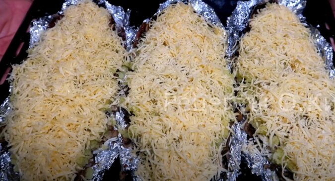 Na wierzchu posypujemy twardym serem, a następnie wstawiamy do piekarnika.