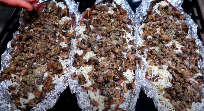 Na wierzchu 3 sztuk ryb układamy w równej warstwie cebulę, następnie serek topiony, zatem pieczarki. Teraz wszystko należy posolić i posypać mieszanką włoskich ziół oraz pieprzem, warstwę ziemniaków również należy posypać ziołami, solą, a także pieprzem.