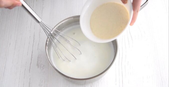 2. Następnie do gorącej mieszanki należy dodać kaszę manną. Aby to zrobić, dodawaj kaszę małymi porcjami i intensywnie mieszaj trzepaczką. Rób wszystko powoli i stopniowo, aby nie powstały grudki.