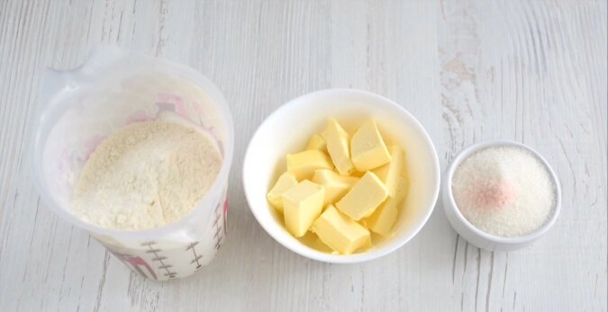 5. Zajmijmy się kruchym ciastem. Przesiej mąkę przez sito. Drobno posiekaj twarde masło nożem lub zetrzyj na tarce. Następnie wymieszaj masło z mąką i cukrem. Dodaj szczyptę soli. Jeśli masz robot kuchenny, możesz go użyć.