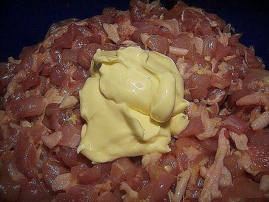 Mięso z kurczaka należy dokładnie umyć, zatem osuszyć papierowym ręcznikiem, nie usuwając skórę, a następnie pokroić w kostkę o wielkości 1,5 – 2 cm (czyli nie zbyt drobną).