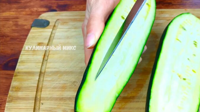 Ogonki cukinii odcinam z obu stron i kroję warzywo wzdłuż na 2 części.