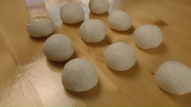 Ciasto dzielimy na dziesięć części, robimy kulki i natłuszczamy masłem. Zostawiamy na 10-15 minut.