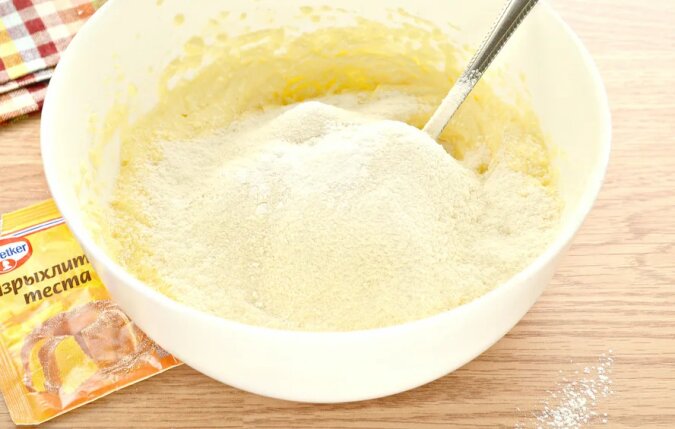 Do powstałej mieszanki przesiej mąkę pszenną razem z proszkiem do pieczenia.