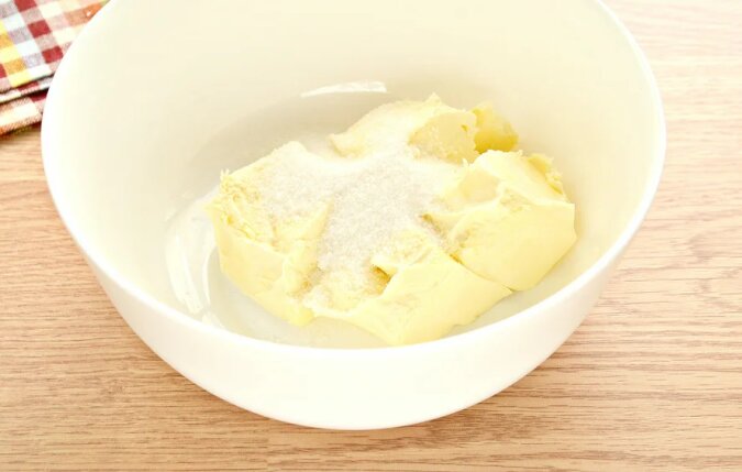 Umieść zmiękczone masło w misce. Dodaj do niego cukier i sól.