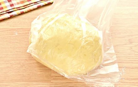 Ciasto wkładamy do plastikowej torebki, a następnie do lodówki na godzinę. Jeśli nie masz czasu, możesz włożyć ciasto do zamrażarki na 15 minut.
