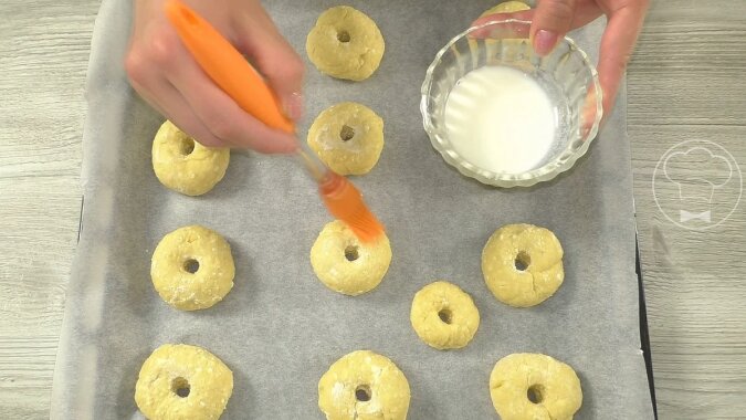 Kulki układamy na blasze wyłożonej papierem do pieczenia, w razie potrzeby natłuszczamy mlekiem w temperaturze pokojowej.