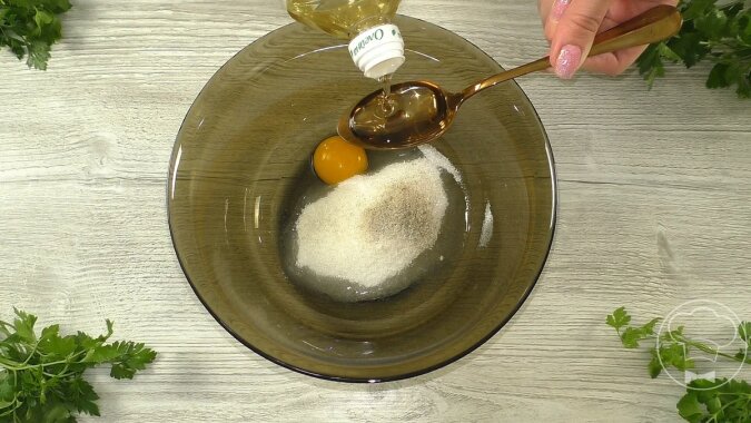 Do jajka dodaj cukier, cukier waniliowy, szczyptę soli i 1 łyżkę oleju roślinnego, dobrze wymieszaj do uzyskania jednolitości.