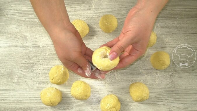 Teraz należy zrobić dziurę w każdym pączku. Użyję do tego dyszy do ciasta, dobrze posypanej mąką. Możesz zostawić pączki - kulki.