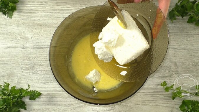 Dodaj twaróg. Wymieszaj.