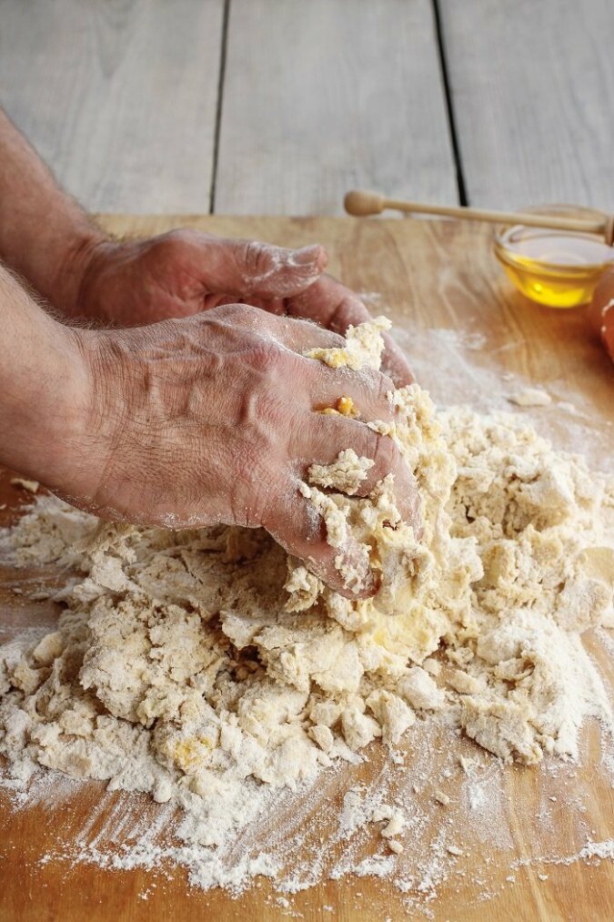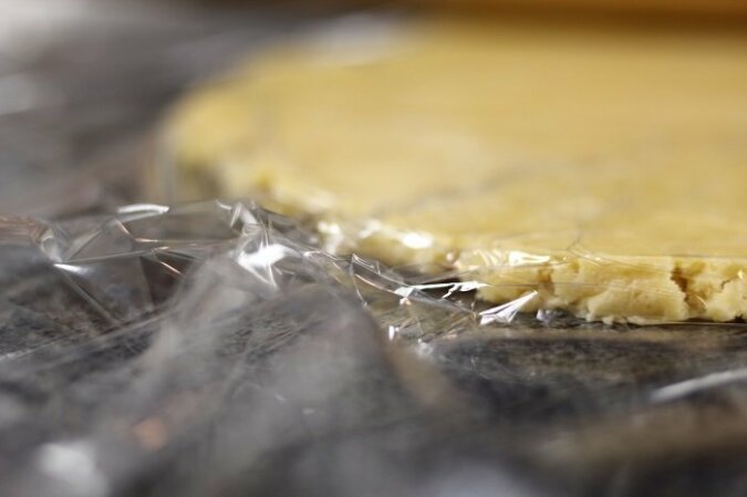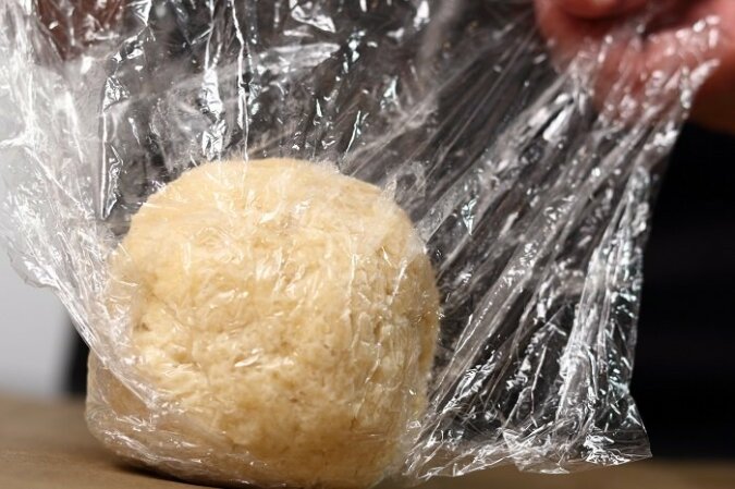 Ciasta nie trzeba wyrabiać, a po prostu zebrać. Ciasto podziel na wymagane kawałki, zawiń w folię i wstaw do lodówki na co najmniej 2 godziny.