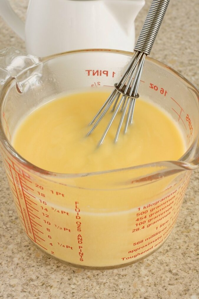 W miarce połącz jajko, sól i ocet. Dobrze wymieszaj i wlej wodę.
