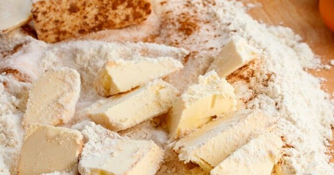 Wysyp trochę mąki na stół. Zetrzyj masło lub margarynę na grubej tarce. Należy pamiętać, że samą tarkę i masło należy posypać mąką.