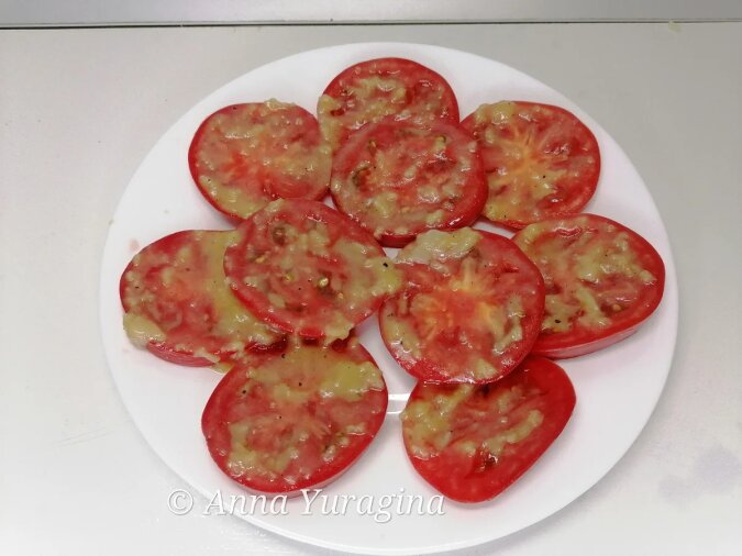 Na wszystkie plastry pomidorów wlewamy otrzymaną mieszaninę.