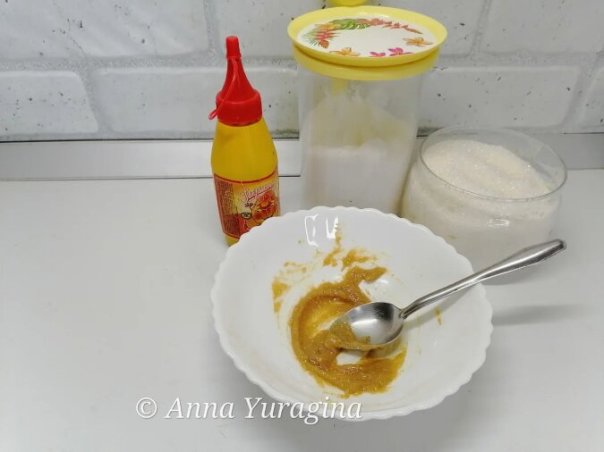 Do małej głębokiej miski wsypujemy cukier, sól, dodajemy musztardę, a następnie wszystko dokładnie mieszamy.