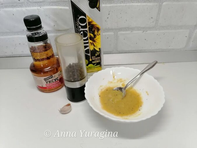 Wlewamy oliwę z oliwek lub olej słonecznikowy, a także ocet jabłkowy. Dodajemy również czosnek, przepuszczony przez prasę do czosnku. Dokładnie wszystko mieszamy.